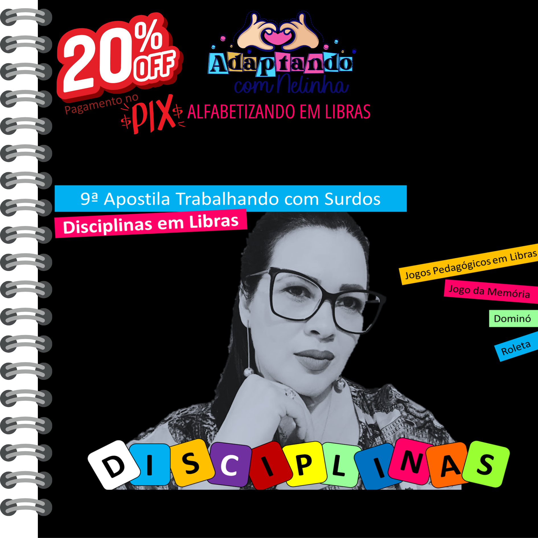 contém: Capas de caderno personalizado com as disciplinas em Libras - Dominó, Jogo da Memória e Roleta sinalizada. Venda no Cartão de crédito, boleto bancário e transferência bancária.