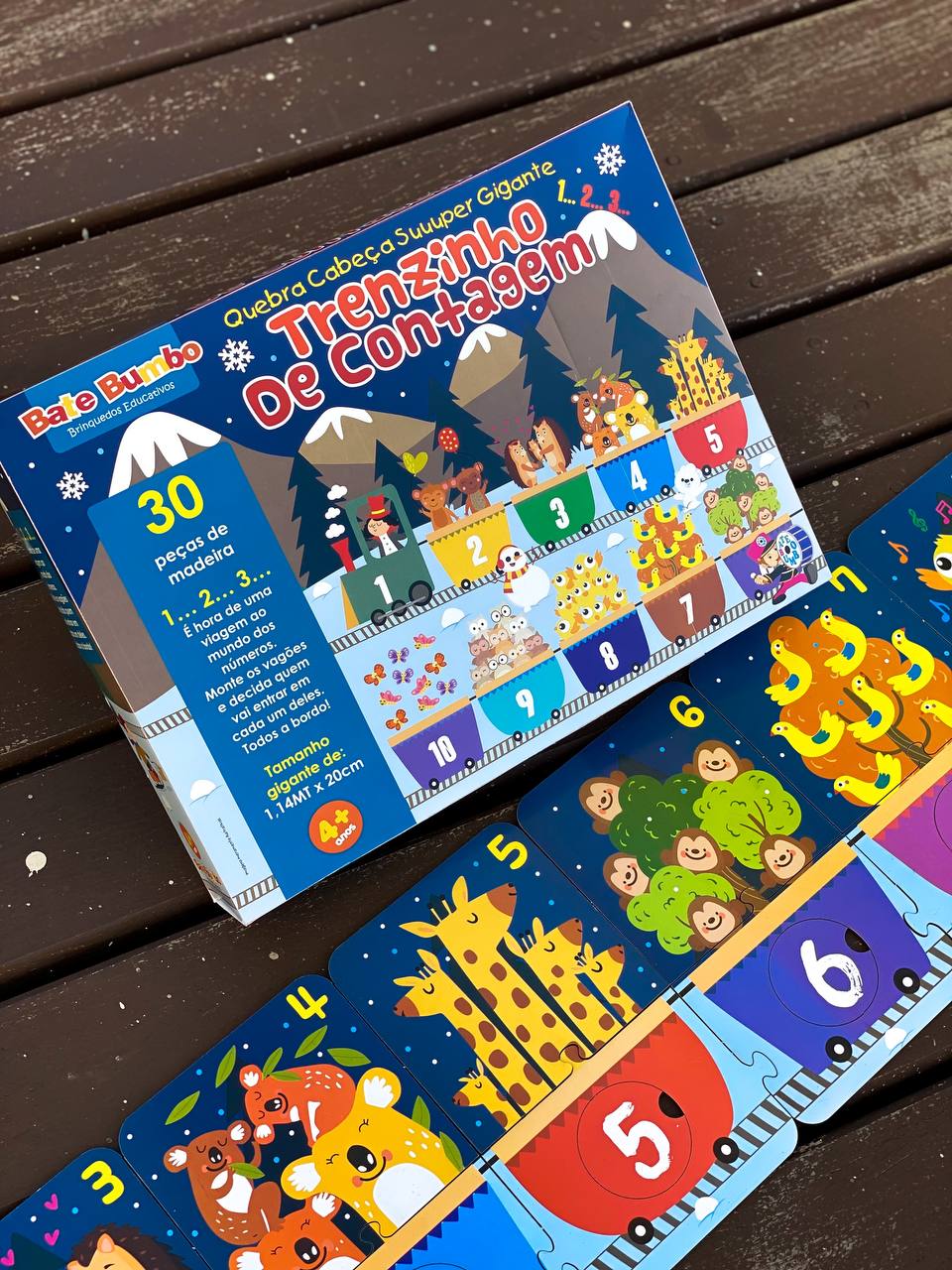 SUPEEER quebra-cabeça GIGANTE. Isso mesmo, esse produto mede 1,14 METROS Os passageiros e os círculos numerados podem ser misturados e combinados para desafiar ainda mais as crianças. Uma ótima ideia criativa que ensina sobre os animais, cores e acima de tudo, a contagem. As peças são gigantes e feitas de madeira de alta qualidade e perfeita para as mãozinhas dos nosso pequenos