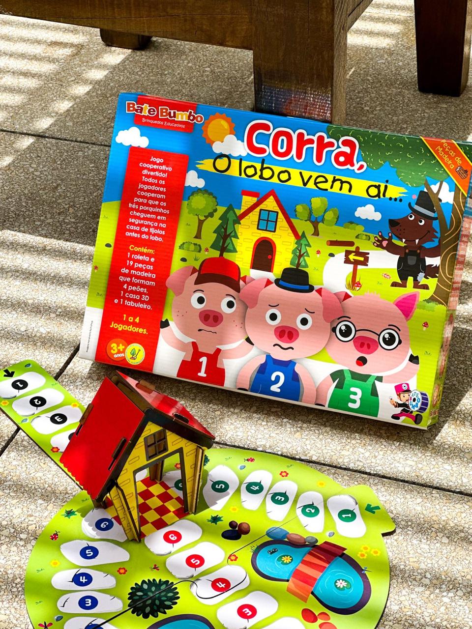CORRA, O LOBO VEM AI… Um divertido jogo cooperativo, onde todos os jogadores trabalham juntos para chegar na casa de tijolos antes do Lobo